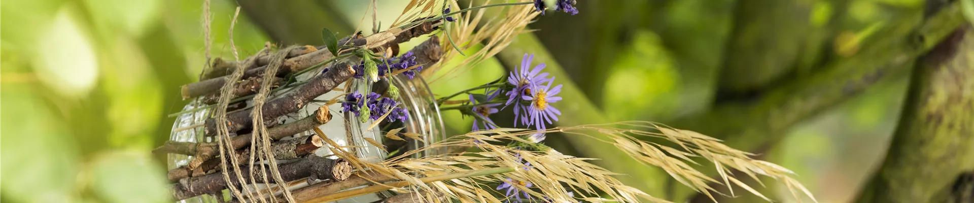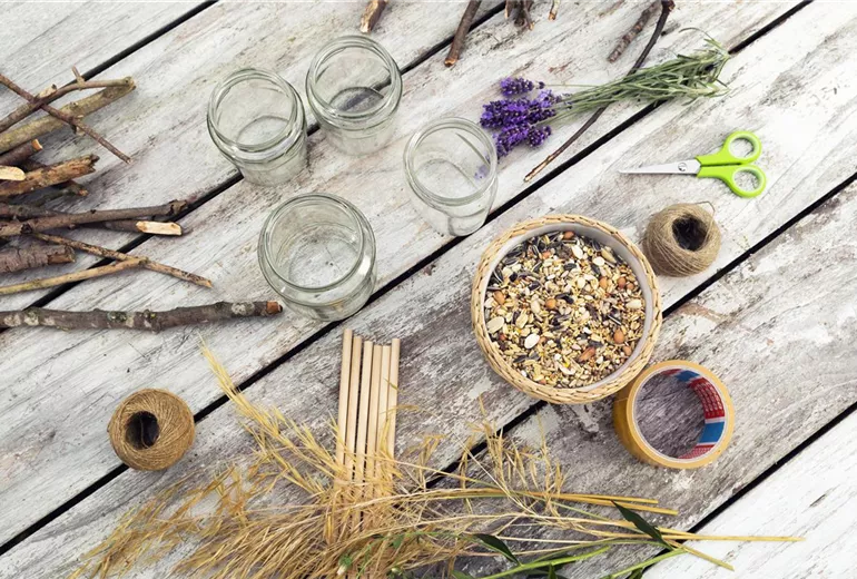 Damit das Vogelhaus nicht einfach nur aus einem Weckglas mit Stöckern besteht, kann es jetzt noch hübsch verziert werden. Besonders gut eignen sich dafür saisonale Wildblumen. Im Sommer verströmt Lavendel einen besonders schönen Duft und sieht dabei auch noch richtig dekorativ aus. Gräser machen sich am Vogelhäuschen auch sehr gut. Je natürlicher die Dekoration am Vogelhaus aussieht, desto wohler fühlen sich die Vögel. Gräser passen sich optimal in das Gartenbild ein und lassen sich durch die dünnen Stiele auch kinderleicht in die Zwischenräume der Stöcker stecken. Damit die Vögel auch gut in das Vogelhaus rein und raus kommen, sollte der Eingang aber nicht von Gräsern und Blüten verdeckt werden. Wenn das Vogelhaus dann fertig dekoriert ist, kann es an den langen Enden vom Paketband im Baum aufgehangen und mit reichlich Vogelfutter befüllt werden.
